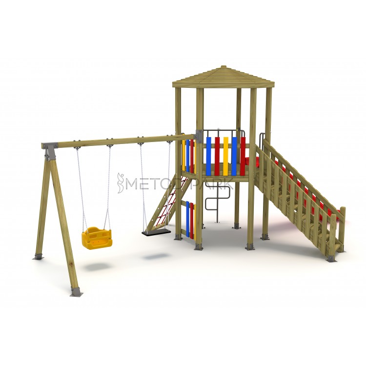Ahşap, polietilen, hdpe, ip halat ve metal malzemelerden oluşur. Metal aksamlar açık hava koşullarına dayanıklı olacak şekilde kumlama yapılarak, galvaniz, polizing astar veya kataforez kaplanarak üzerine elektrostatik toz boya uygulanır. Polietilen parçalar renkli elektriklenmeyi önleyecek anti-statik özellikli ve sağlığa zararsız malzemeden üretilmiştir. Ahşap parçalarda, emprenyelenmiş 1. Sınıf malzeme kullanılır .